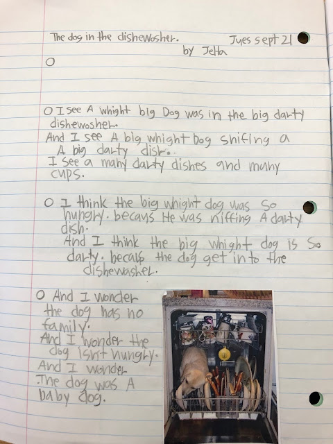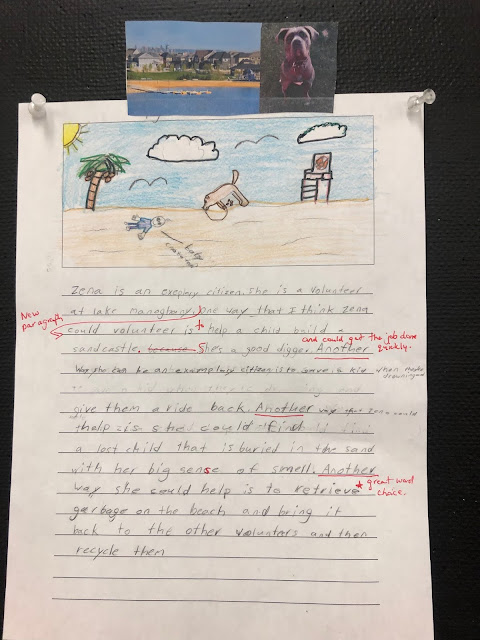 In Literacy we have; wrote an I see, I think, I wonder about a dog in a dishwasher, completed a visual journal page on "The Problem With Waste", worked on a short essay about a volunteer dog named Zena.